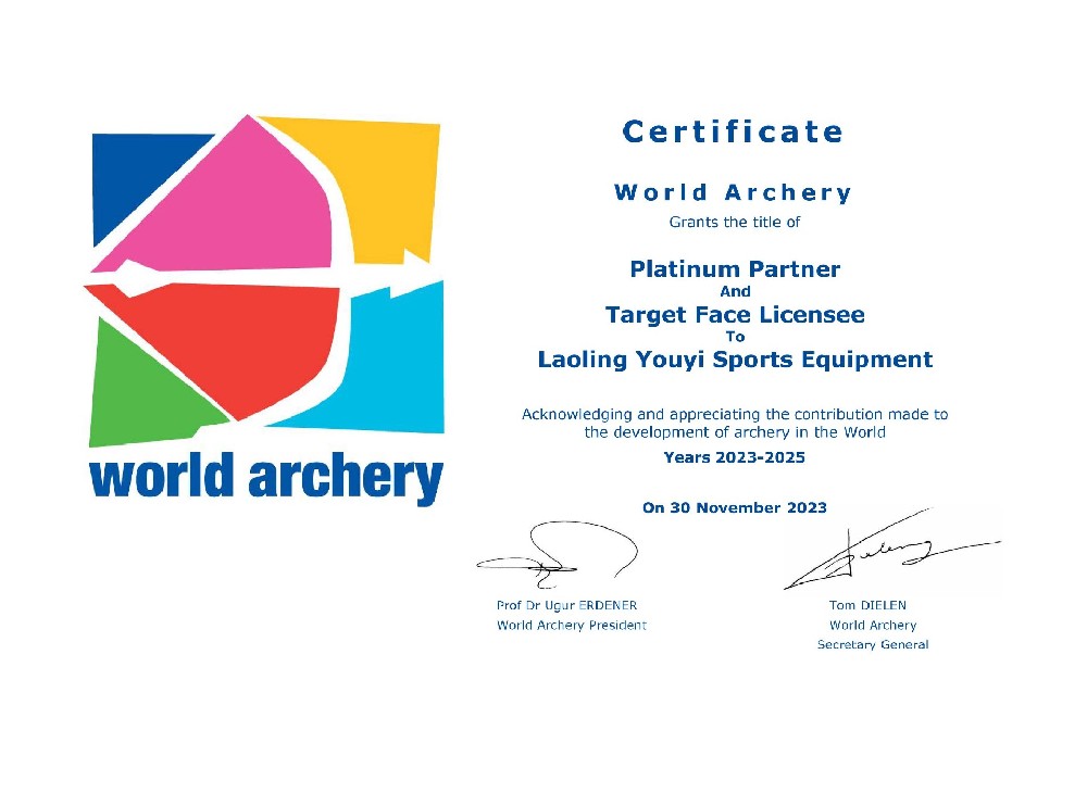 目前,主要生產(chǎn)和銷售射箭比賽及訓(xùn)練專用器材,包括:箭靶、靶紙、靶架、號碼牌、風(fēng)向旗、計(jì)時記分器等場地器材設(shè)備;反曲弓、復(fù)合弓、傳統(tǒng)弓、瞄準(zhǔn)器、防震桿等弓箭裝備;箭壺、護(hù)胸、護(hù)臂、護(hù)指等各類箱包護(hù)具。公司所生產(chǎn)的射箭器材已通過國際射箭聯(lián)合會及中國射箭協(xié)會CAA認(rèn)證。
